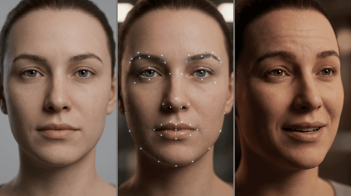 AI systems analyze facial features and map key points; eyes, mouth, jawline, cheekbones; to create a digital framework for animation.